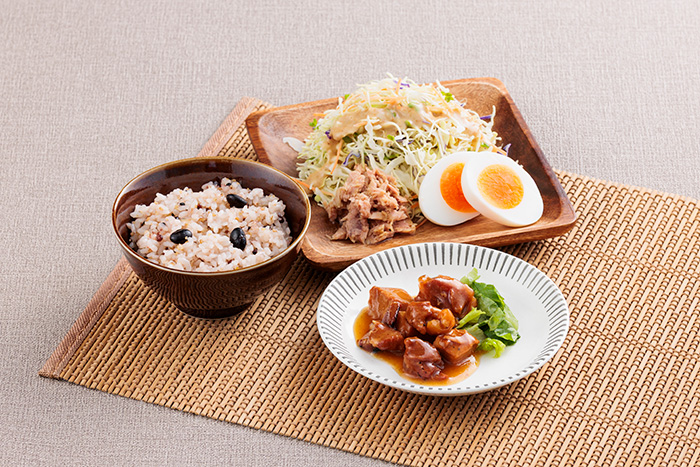 はくばく十六穀ごはんパック+サラダクラブ焙煎胡麻ドレッシングミニパック+ホテイフーズやきとりたれ味+キューピーのたまごゆでたまほんのり塩味+サラダコスモブロッコリーの新芽プレミアムサラダ+はごろもシーチキンスマイルプチ旨塩ごま油