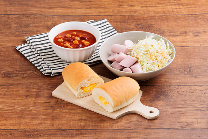 ヤマザキ コッペパンたまご+クノールポタージュで食べる豆と野菜深いコクの完熟トマト+ニッスイ速筋タンパクソーセージ減塩MSC+サラダクラブブロッコリースーパースプラウト彩りミックスサラダ