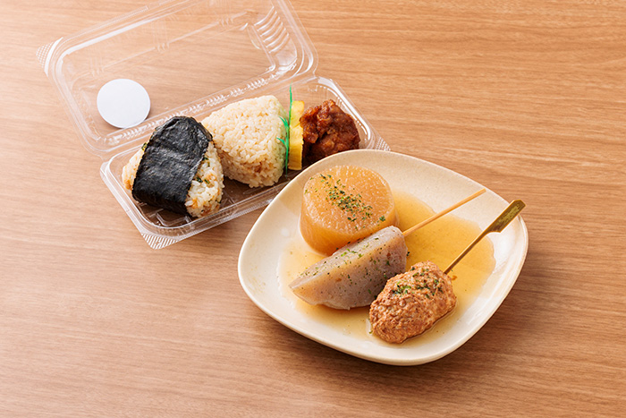 静岡の老舗お弁当店からは、静岡名物ともいえるおでんとおにぎりの定番の組み合わせ。中でもバタ練りこんにゃくとは、専用の機械でバタバタと練り上げる伝統的な製法で手間ひまかけて作られるこんにゃくのこと。気泡が入って味が染み、おいしくなるため、おでんにはぴったりなのだとか。こだわりのやげん軟骨つくねや、おにぎりに入ったおかずの唐揚げでタンパク質を摂ることもできます。
