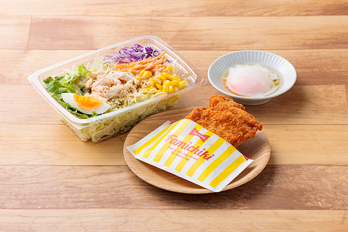 静岡県内に497店舗(2026年1月末時点)あるファミリーマート。今回の組み合わせは、車の中や出先ですぐに食べられる気軽さが嬉しい、大人気のファミチキや温泉たまごといったお手軽フード。サクサクッとした衣の食感と、柔らかくてジューシーな鶏肉の旨みが大好きな人も多いのでは? でもそれだけで満足せず、野菜サラダやごまドレッシングをメニューに加えるちょっとした一手間で、野菜を約120gもとれるバランスの良い食事になります。